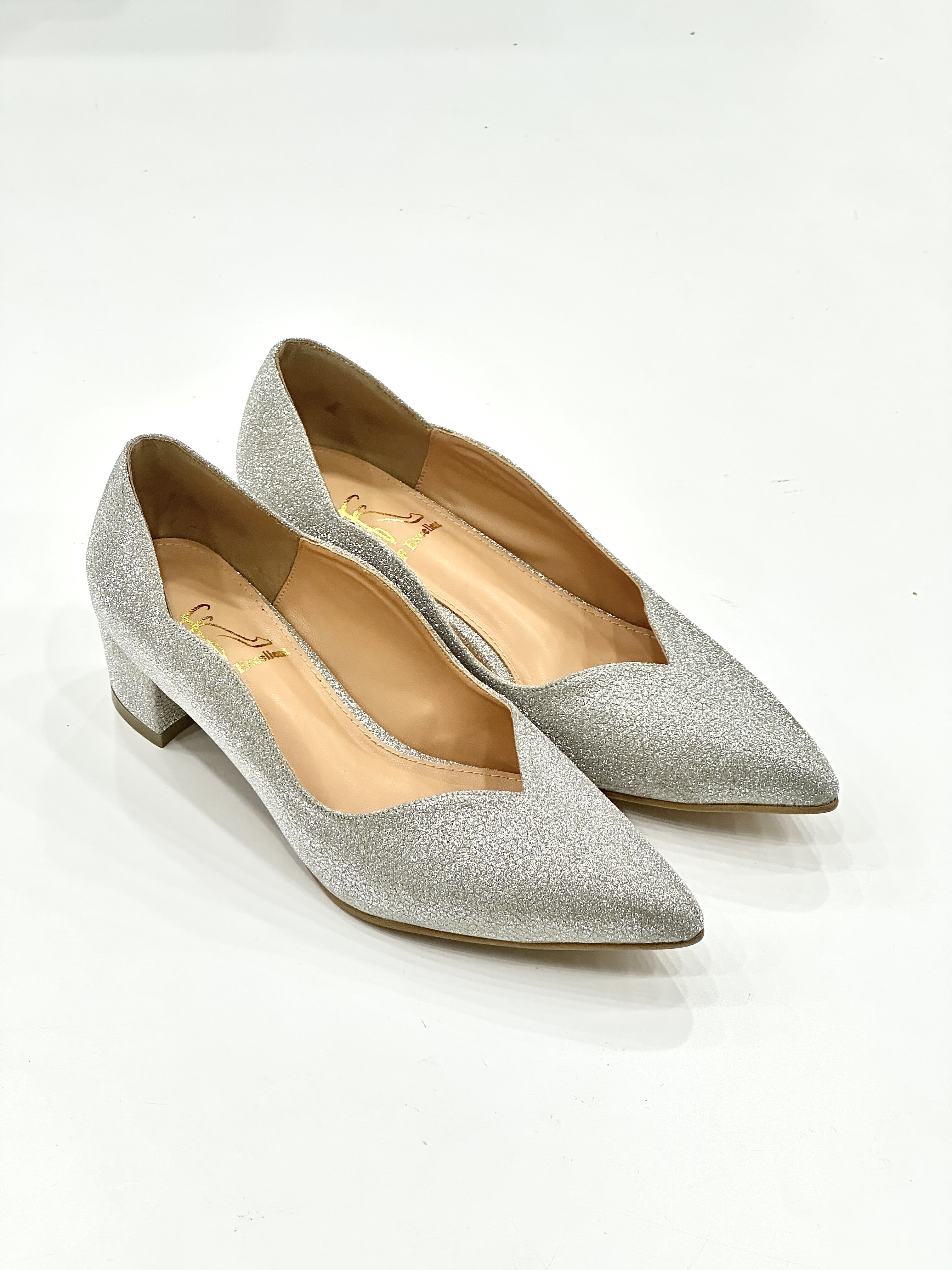 Ziah pumps feature a 1.5-inch block heel for comfort and stability, paired with a pointed toe silhouette that elongates the legs. Crafted in glitter fabric, this fully covered style shimmers with every step, making it perfect for weddings, dinners, evening events, or special occasions. The unique side-wave scallop cutting at the front adds a touch of elegance, setting it apart from classic pumps.
